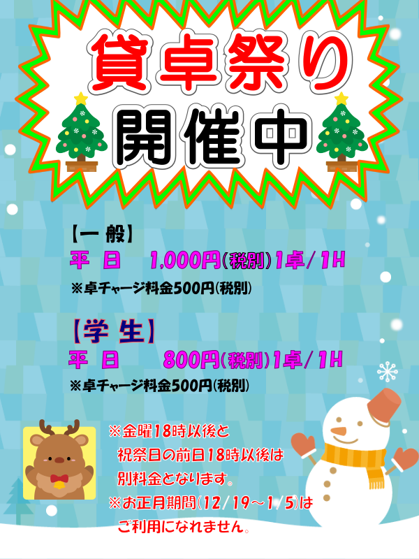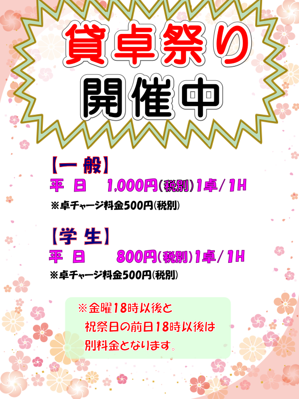 600円 / 400円(税込) 【セット】 ☆通常料金 (一 般) 平 日 1,100円(税込) / 1時間(1卓) 金曜18時~ 1,540円(税込) / 1時間(1卓) 祝祭日前日18時~ 1,540円(税込) / 1時間(1卓) ※卓チャージ料金:550円(税込) (学 生) 平 日 880円(税込) / 1時間(1卓) 金曜18時~ 1,100円(税込) / 1時間(1卓) 祝祭日前日18時~ 1,100円(税込) / 1時間(1卓) ※卓チャージ料金:550円(税込) |