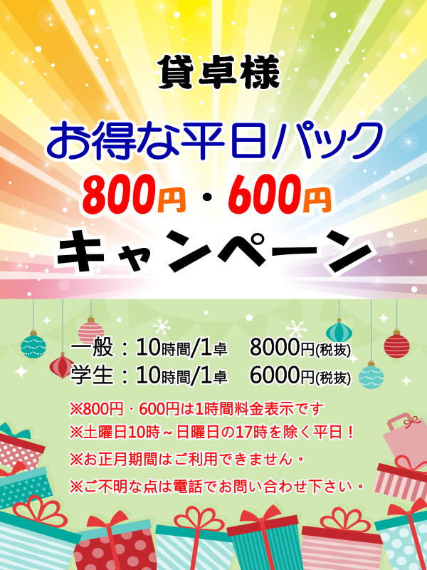 4人打ち 600円(税込) 【セット】 ☆お正月料金(12/26~1/4) 一般 1,800円(税込1,980円) 会員 1,400円(税込1,540円) ※会員のみ5時間パック(17時~)ご利用できます。 ※詳しくはお電話でお問い合わせ下さい。 ※アルコール類の持ち込みはご遠慮ください。 ※お正月期間はサービス券・クーポンは使えません。 ☆お得な平日パック 800円・600円キャンペーン☆ 一般 8,000円 10時間パック(税込8,800円) 学生 6,000円 10時間パック(税込6,600円) ※上記は1卓/10時間料金になります。 ※土曜日10時~日曜日の17時までを除く平日。 ※10時間以後は1卓/1時間「一般800円・学生600円」 (税別)となります。 ※ご不明な点は電話でお問い合わせ下さい。 ☆12/26~1/4は適用外となります。 ☆通常セット料金☆ 一 般 1,400円(税込1,540円) 1卓 / 1時間 5時間パック 5,000円(税込5,500円) 1卓 / 5時間 ※5時間パックは17時からご利用になれます。 ※5時間を過ぎは1,000円(税込1,100円) 1卓 / 1時間 でご利用できます。 |