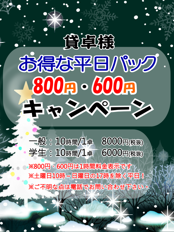 4人打ち 600円(税込) 【セット】 ☆お得な平日パック 800円・600円キャンペーン☆ 一般 8,000円 10時間パック(税込8,800円) 学生 6,000円 10時間パック(税込6,600円) ※上記は1卓/10時間料金になります。 ※土曜日10時~日曜日の17時までを除く平日。 ※10時間以後は1卓/1時間「一般800円・学生600円」 (税別)となります。 ※ご不明な点は電話でお問い合わせ下さい。 ☆通常セット料金☆ 一 般 1,400円(税込1,540円) 1卓 / 1時間 5時間パック 5,000円(税込5,500円) 1卓 / 5時間 ※5時間パックは17時からご利用になれます。 ※5時間を過ぎは1,000円(税込1,100円) 1卓 / 1時間 でご利用できます。 |