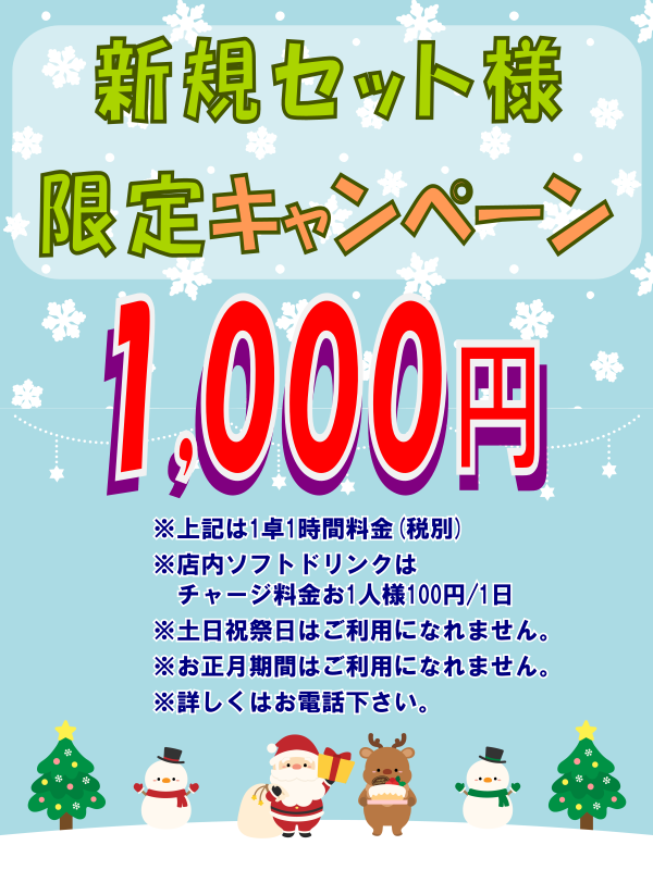 四人打ち 600円(税込) 【セット】 ☆お正月料金(12/26~1/4) 一律 2,000円(税込2,200円) ※ソフトドリンク・チャージ料金:お1人様100円 / 1日 一部有料ドリンク・食事あり ※サービス券・クーポンはご利用になれません。 ☆新規セット様キャンペーン 1,000円(税込1,100円) / 1時間(1卓) ※ソフトドリンク・チャージ料金:お1人様100円 / 1日 一部有料ドリンク・食事あり ※土日祝祭日はご利用になれません。 ※お正月期間はご利用になれません。 ☆通常料金 月曜~木曜(平日) 一般 1,600円(税込1,760円) / 1時間(1卓) 学割 1,300円(税込1,430円) / 1時間(1卓) 金曜~日曜、祝祭日 一般 2,000円(税込2,200円) / 1時間(1卓) ※ソフトドリンク・チャージ料金:お1人様100円 / 1日 一部有料ドリンク・食事あり |