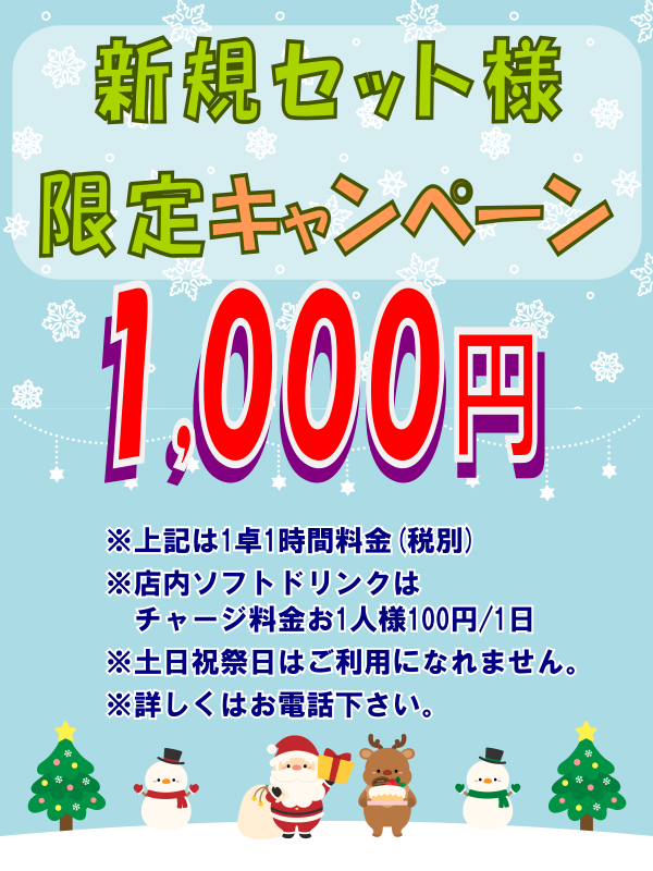 四人打ち 600円(税込) 【セット】 ☆新規セット様キャンペーン 1,000円(税込1,100円) / 1時間(1卓) ※ソフトドリンク・チャージ料金:お1人様100円 / 1日 一部有料ドリンク・食事あり ※土日祝祭日はご利用になれません。 ☆通常料金 月曜~木曜(平日) 一般 1,600円(税込1,760円) / 1時間(1卓) 学割 1,300円(税込1,430円) / 1時間(1卓) 金曜~日曜、祝祭日 一般 2,000円(税込2,200円) / 1時間(1卓) ※ソフトドリンク・チャージ料金:お1人様100円 / 1日 一部有料ドリンク・食事あり |