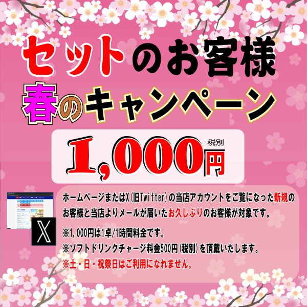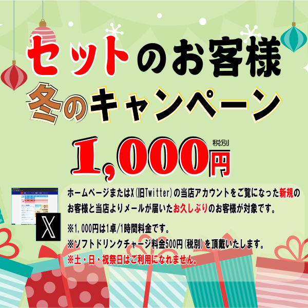4人打ち 600円(税込) 【セット】 ☆冬のキャンペーン 対象:新規・お久しぶりのセット様 1,000円(税込1,100円) 1卓 / 1時間 ※ソフトドリンク・一日チャージ料金550円(税込) を頂戴しています。 ※土・日・祝日はご利用になれません。 ☆通常料金(改定) 一 般 1,540円(税込) 1卓 / 1時間 ※ソフトドリンク・一日チャージ料金550円(税込) を頂戴しています。 |