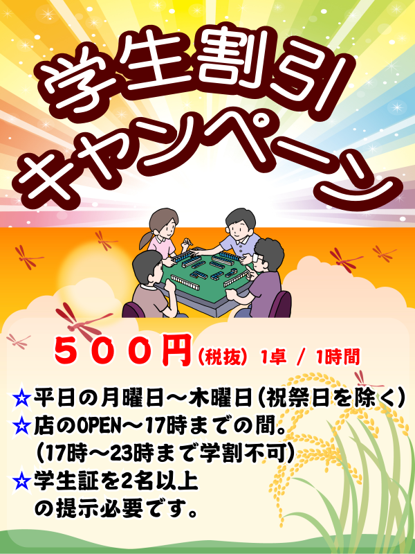 600円 / 350円(税込) 【セット】 ☆学生割引キャンペーン実施中 500円 (税込550円) 1時間 / 1卓 【条件】 ※平日の月曜日~木曜日(祝祭日を除く) ※フリードリンク無し アルコール類以外の持込OK! ※学生証を2名以上の提示が必要です。 ※ご不明な点はお問い合わせ下さい。 ☆通常料金 一 般 平日 1,320円(税込) 1時間 / 1卓 土日祝祭日 1,540円(税込) 1時間 / 1卓 |