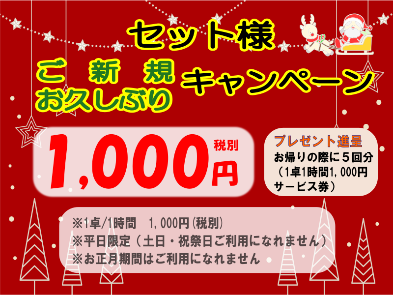 600円(税込) 【セットお正月料金】(12/26~1/4) 会 員 1,600円 (税込1卓 / 1時間) 非会員 2,000円 (税込1卓 / 1時間) ※期間中は学割・レディース割はありません。 ※キャンペーン、サービス券、クーポンはご利用になれません。 【セット料金】 ★新規セット様キャンペーン 一般 1,100円(税込1卓 / 1時間) ※平日限定(土日・祝祭日はご利用になれません) ※お正月期間はご利用になれません。 ※ご不明な点はご連絡ください。 ★通常料金 一般 1,320円(税込) 1卓 / 1時間 女性割 1,210円(税込) 1卓 / 1時間 (1~2人) 女性割 990円(税込) 1卓 / 1時間 (3~4人) 学割 660円(税込) 1卓 / 1時間(3人以上) ※毎週水曜日はレディースDAY 13時~17時無料 条件:1卓/女性4名以上 卓数に制限がございます ※土日祝祭日・お盆・正月・GWを除く |